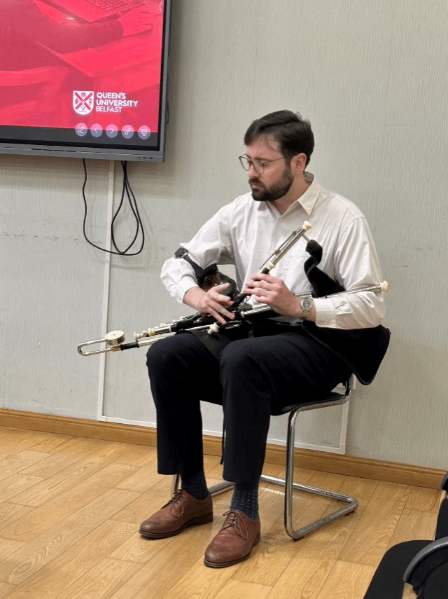在互动环节,师生与嘉宾围绕爱尔兰音乐跨文化传播中传统性与全球化的张力展开深入交流,并就爱尔兰音乐对中国民间乐队的影响与接受分享了见解,讨论热烈,现场气氛活跃。讲座结束后,卡恩斯博士在现场为大家演奏了爱尔兰风笛,悠扬的笛声为本次学术活动增添了生动的文化体验。